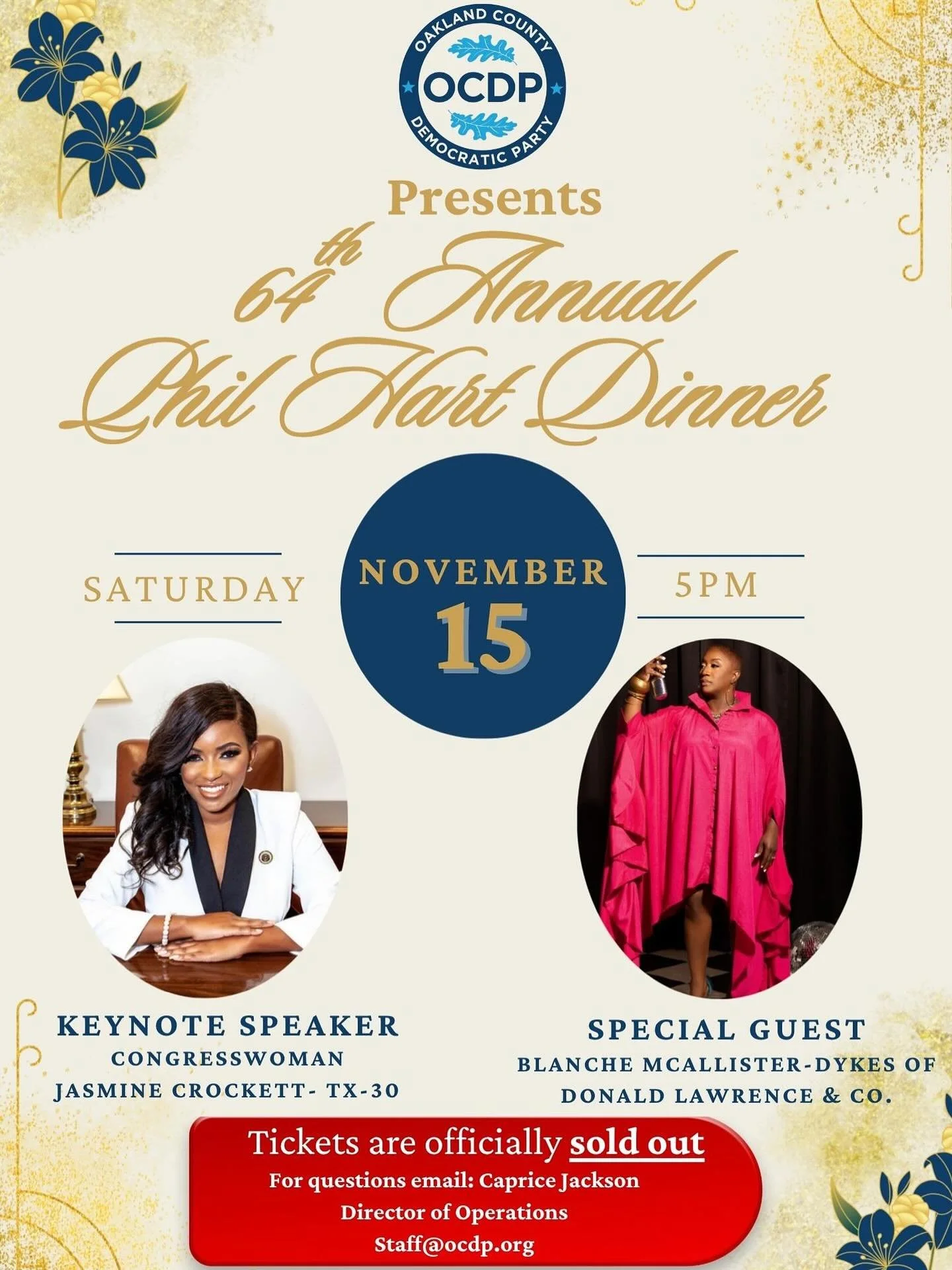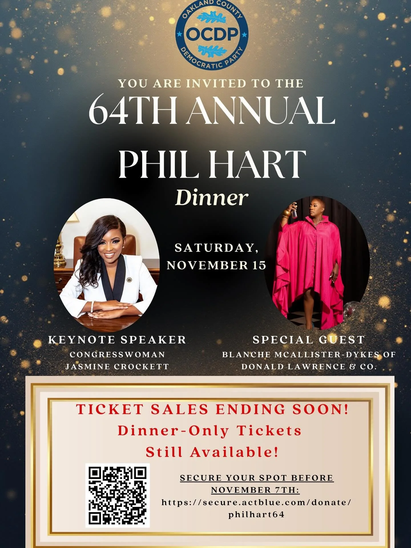 In 2025, OCDP is focused on recruiting and helping Democratic candidates to run in local lections, promoting social and economic justice, and building an engaged Democratic majority in Oakland County in order to enhance the quality of life for all. Please join us with your activism, your membership, your votes and your voice to help move Michigan forward. And be sure to join us at our 64th Annual Phil Hart Dinner on November 15, featuring Congresswoman Jasmine Crockett. See the promo video below.