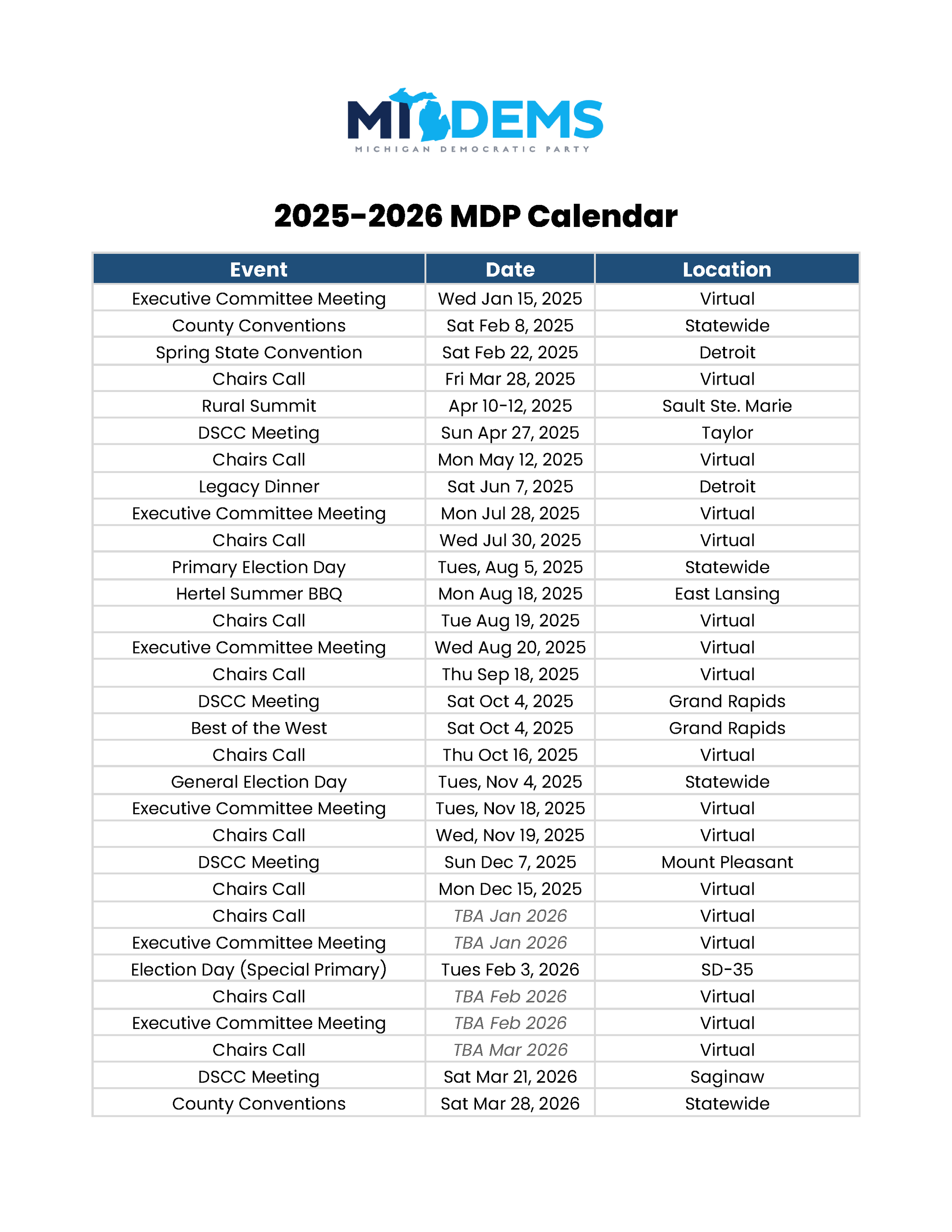 Join us at the Michigan Democratic Party's 2025 Spring Convention. Constituency group caucuses will meet in the morning. All 13 congressional districts will caucus at 1 p.m. to elect new leadership, as well as members to the State Central Committee. We'll also elect a Chair and two Vice-Chairs to serve the State Central Committee. The convention itself will begin at 3 p.m.